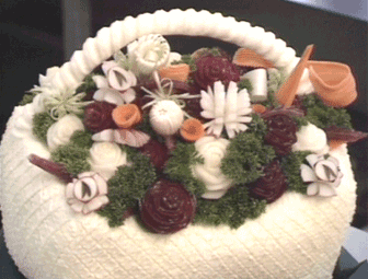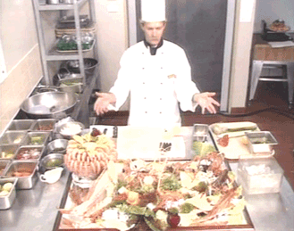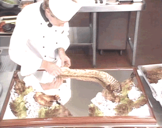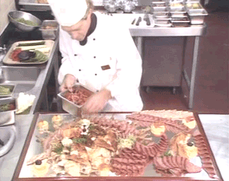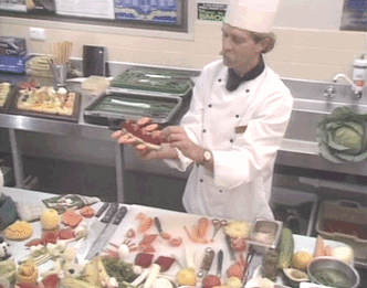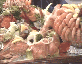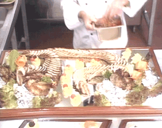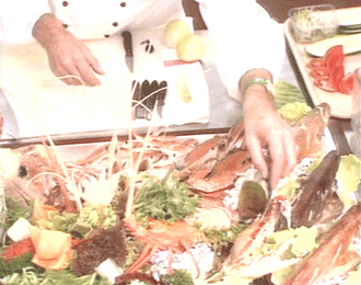 Seafood MirrorThis program shows the construction of a prawn fountain, decoration of prawn platter. preparation of crayfish, cutting of lemon wedges. Placing of various fish and seafood, including crab, smoked salmon, mussels, squid, oysters, whole baked snapper, and utilises most of the garnishes shown on Garnishing I & II - using all fresh produce from local markets. |