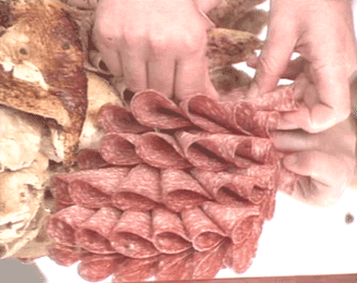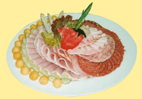 Chicken & Continental Meats MirrorThis shows use of a slicing machine to slice all meats and cutting of chicken pieces: the technique of folding cold sliced meats and garnishing up on the mirror. |